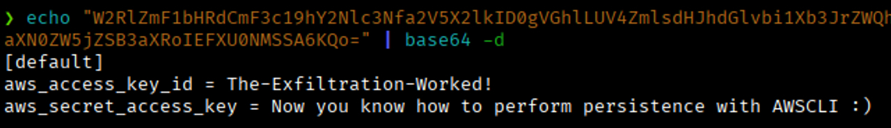 As explained earlier, the one-liner persists, so executing any sts command again will retrigger the credential exfiltration process. This could just as easily be replaced with a reverse shell or any other payload of your choice.