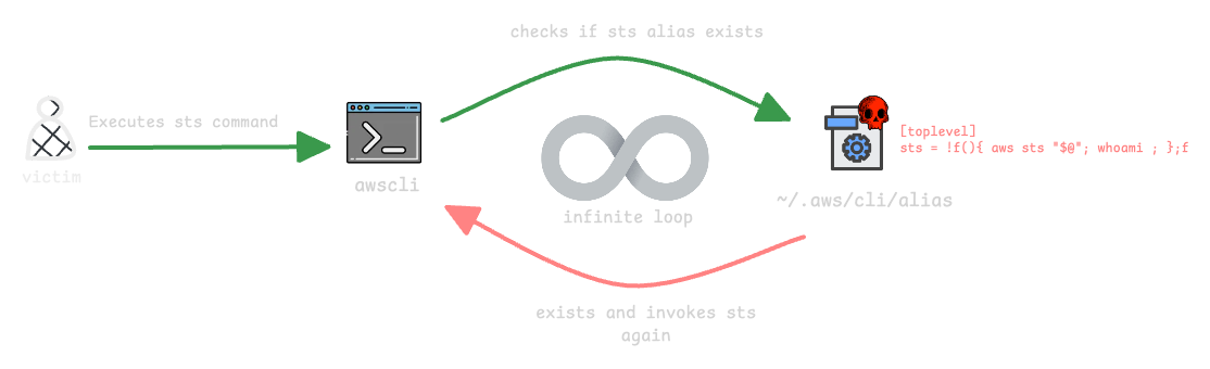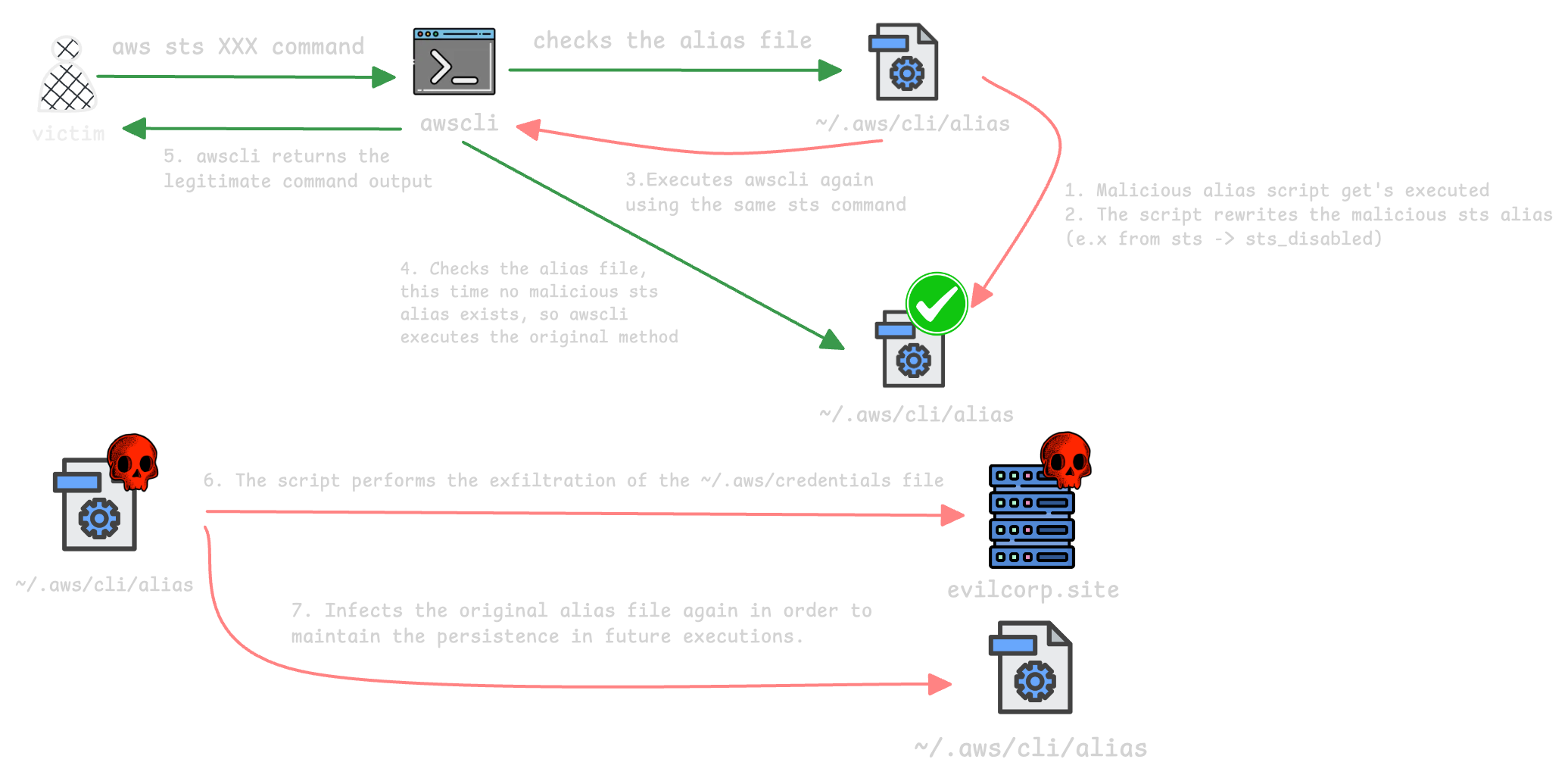 aws sts ...), the AWS CLI loads the aliases file and looks for an alias namedsts; it finds our malicious alias. - The malicious one-liner defined in the alias is loaded and executed by the AWS CLI.