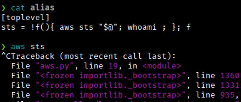 stsalias anymore, it executes the originalstscommand and returns the expected response to the user. - After the legitimate command completes, the one-liner executes our custom persistence actions — in my proof of concept I simulated exfiltrating AWS credentials to an attacker-controlled server.