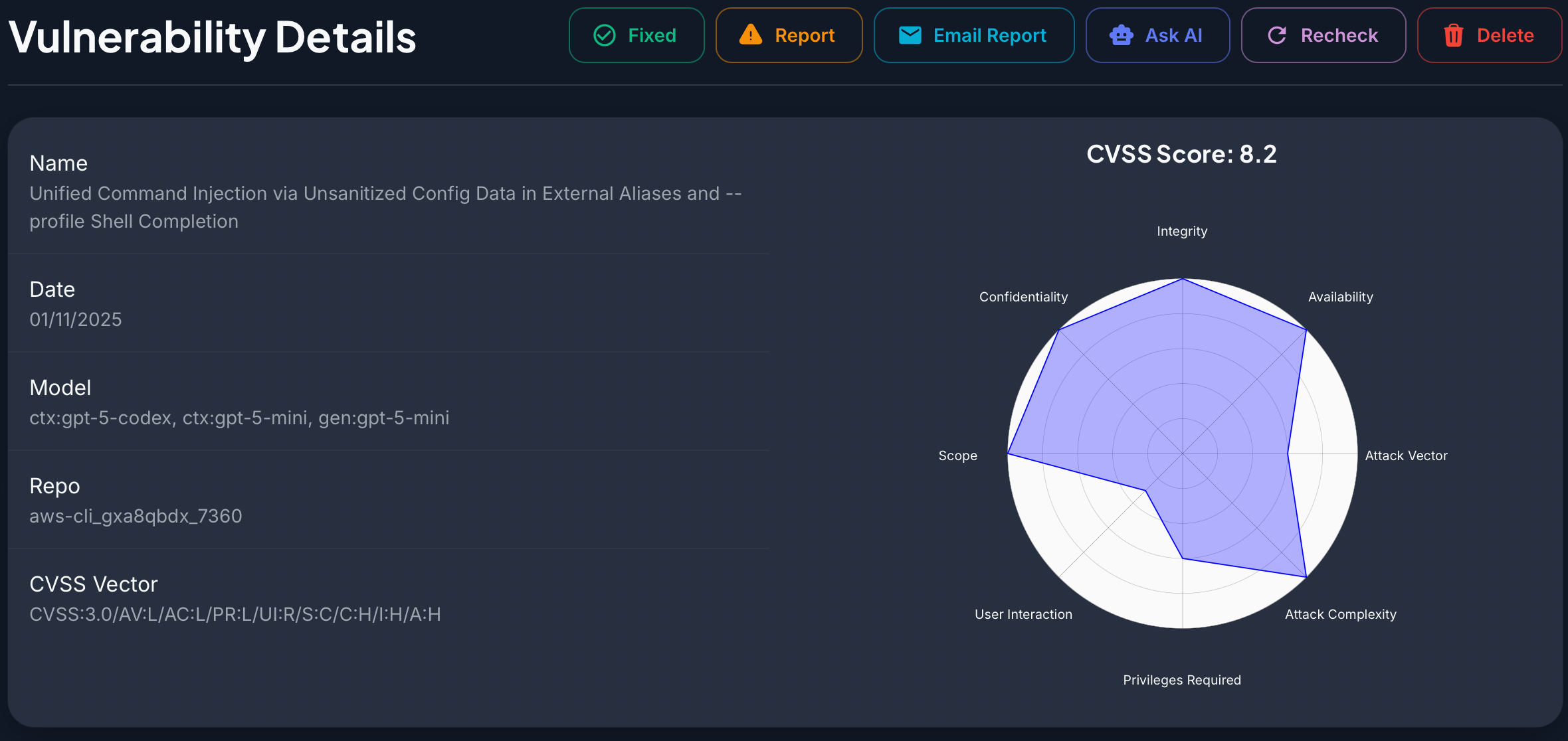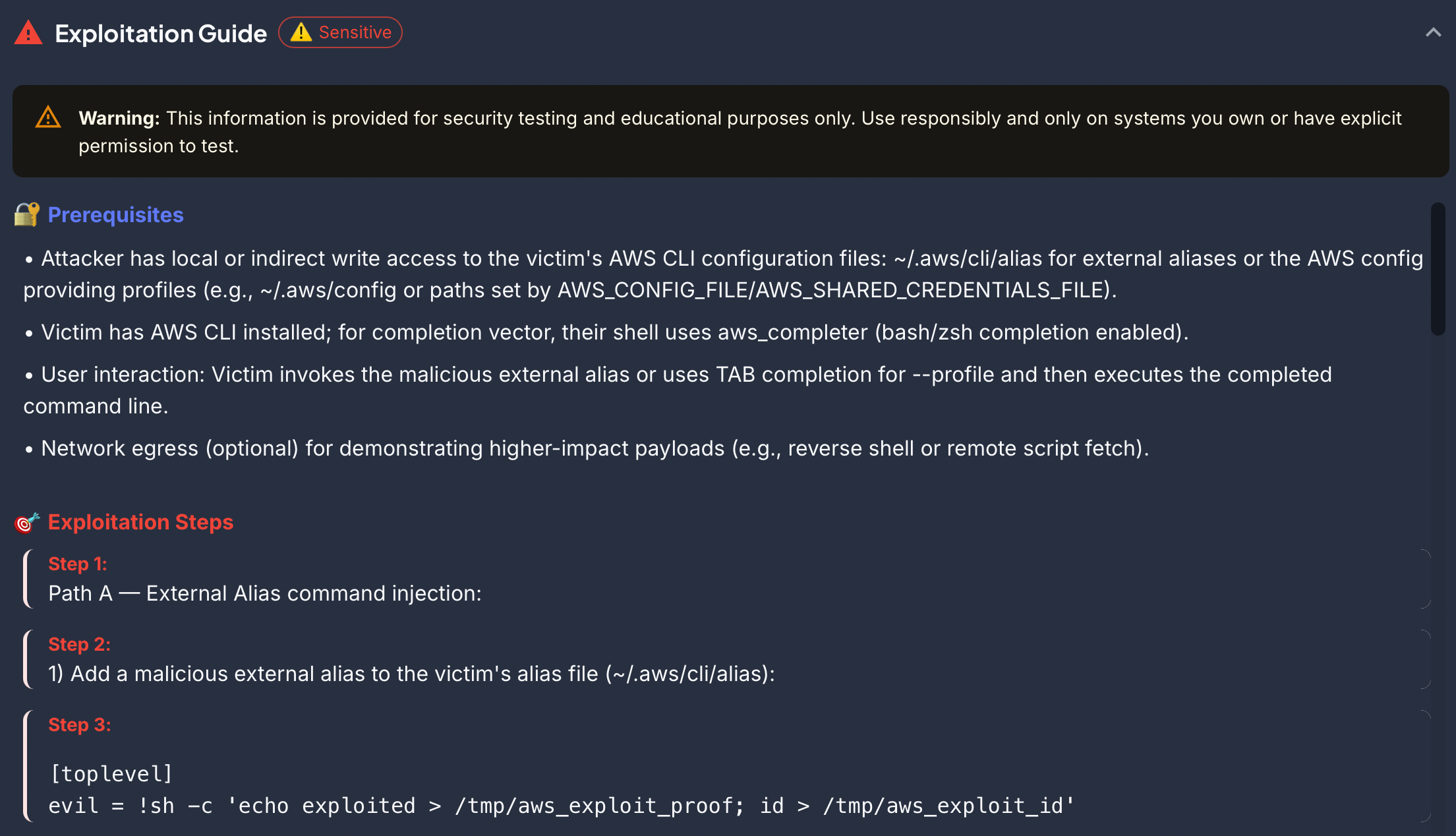 It’s called Naxus AI, Naxus is a AI multi-agent platform that scans code and discovers vulnerabilities in the exposed assets of a project. That makes it very useful for us as researchers, because the issues Naxus identifies are typically reachable. Unlike many scanners, when properly configured Naxus produced almost no false positives for me — in this research I didn’t even know about the AWS CLI alias functionality, but Naxus recognized the ability to abuse it for command execution, which led me to deep-dive into how it works and develop the persistence payload: